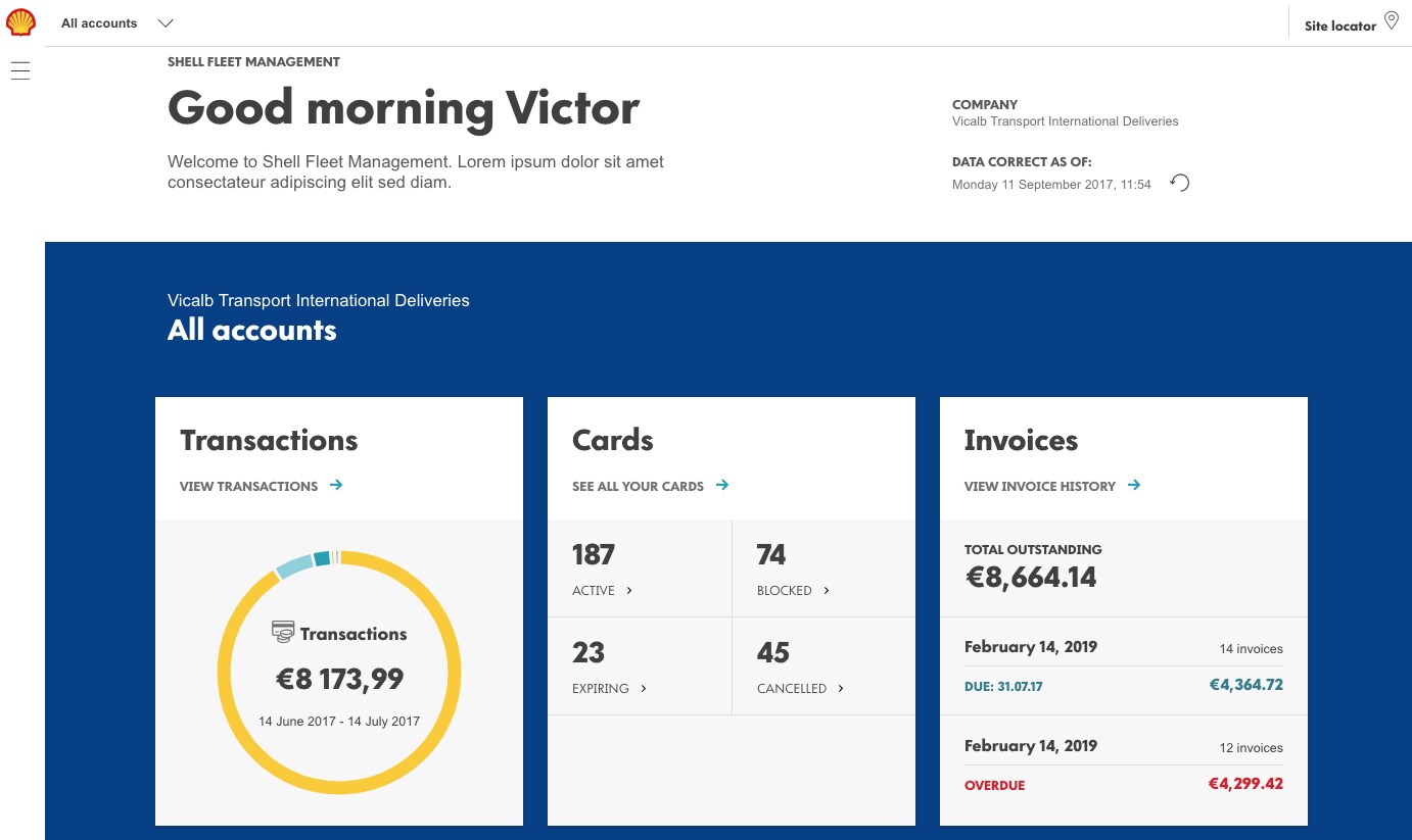 As design and CX lead, I helped Shell reimagine and deliver a new digital core: Shell Fleet Hub: a global, modular, enterprise-grade fleet management platform. Vision & Strategy Defined an experience strategy and MVP roadmap that visualized Shell’s future-state as a mobility service platform, not just a fuel card provider. Created design principles rooted in research: Insightful, Predictive, Empowering—used to guide visual design, architecture, and interaction models. Aligned cross-functional buy-in by showcasing tangible user journeys that supported Shell’s “Every Customer, Every Time” vision. Design Research & Competitive Analysis Conducted interviews with fleet managers across markets to surface pain points, expectations, and triggers for switching behavior. Mapped competitor offerings to identify opportunity areas where Shell could lead, not merely follow. Foundational insight: users wanted more than transactions; they wanted real-time visibility, automation, and ease of control across their fleet. Agile Delivery at Global Scale Co-created the Shell Fleet Hub platform in partnership with Shell, Zensar, and API vendors across geographies. Built a modular, cloud-native platform architecture, enabling service expansion (e.g. telematics, tolls) through plug-and-play modules. Embedded design thinking into the agile delivery process, creating an adaptable framework Shell could extend over time. Focused on onboarding UX and micro-interactions, delivering small but critical moments that created trust, clarity, and confidence for first-time users.